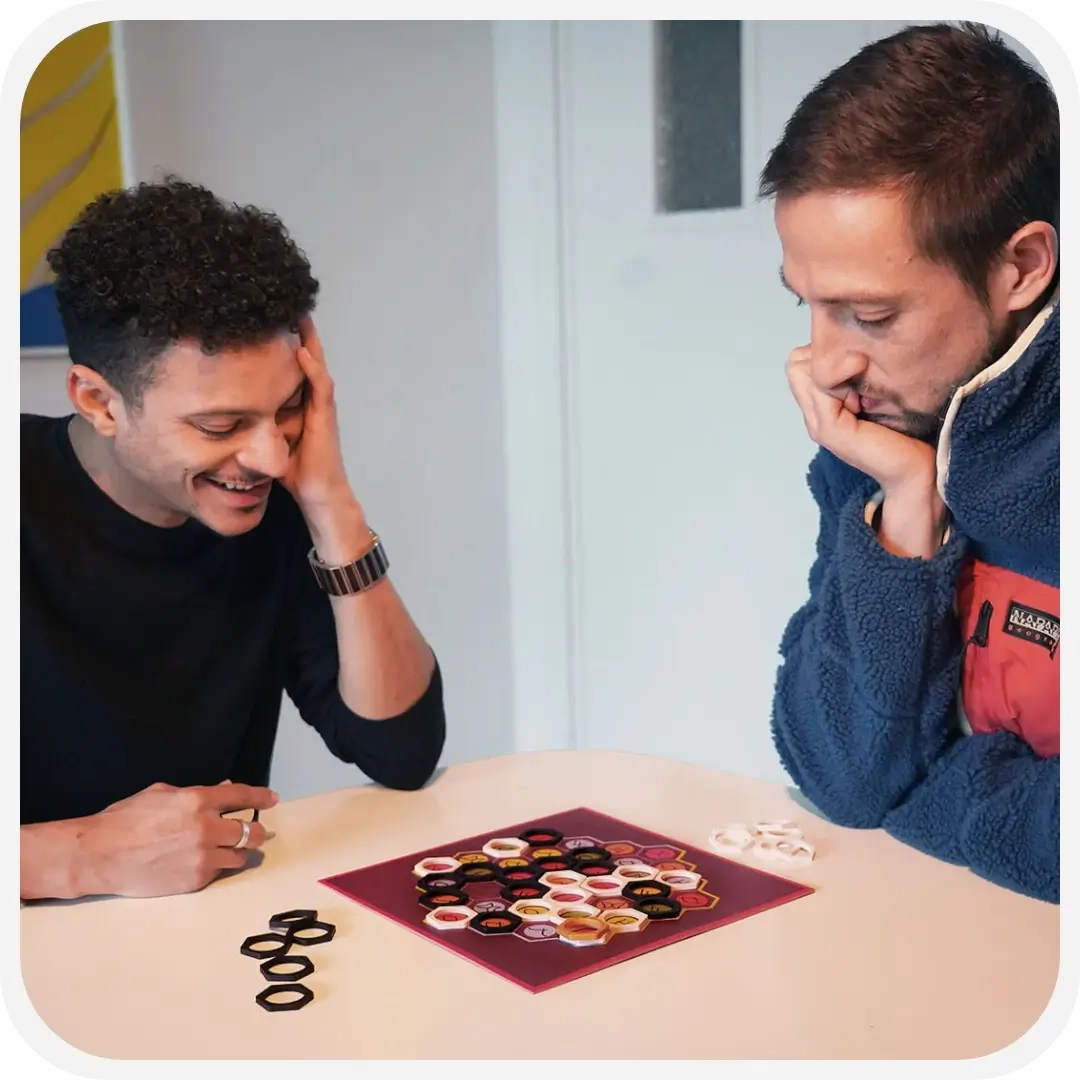 Bij de start leggen beide spelers hun pionnenvoorraad klaar, verdeel je samen de Kamon-jetons over het bord en bepaal je wie met wit en zwart speelt. De speler met zwart begint, plaatst een pion op het bord en markeert die met de gouden pion – deze geeft aan welke kleur of symbool de volgende speler moet volgen. Stel: zwart speelt op een geel vlindervak. Dan mag wit de volgende zet óf op kleur geel, óf op het vlindersymbool kiezen. Zo beïnvloed je met elke zet niet alleen je eigen kansen, maar ook die van je tegenstander. Win door twee randen van dezelfde kleur te verbinden, een lus te maken of je tegenstander volledig vast te zetten – voor elke winnaar is een andere strategie de sleutel!