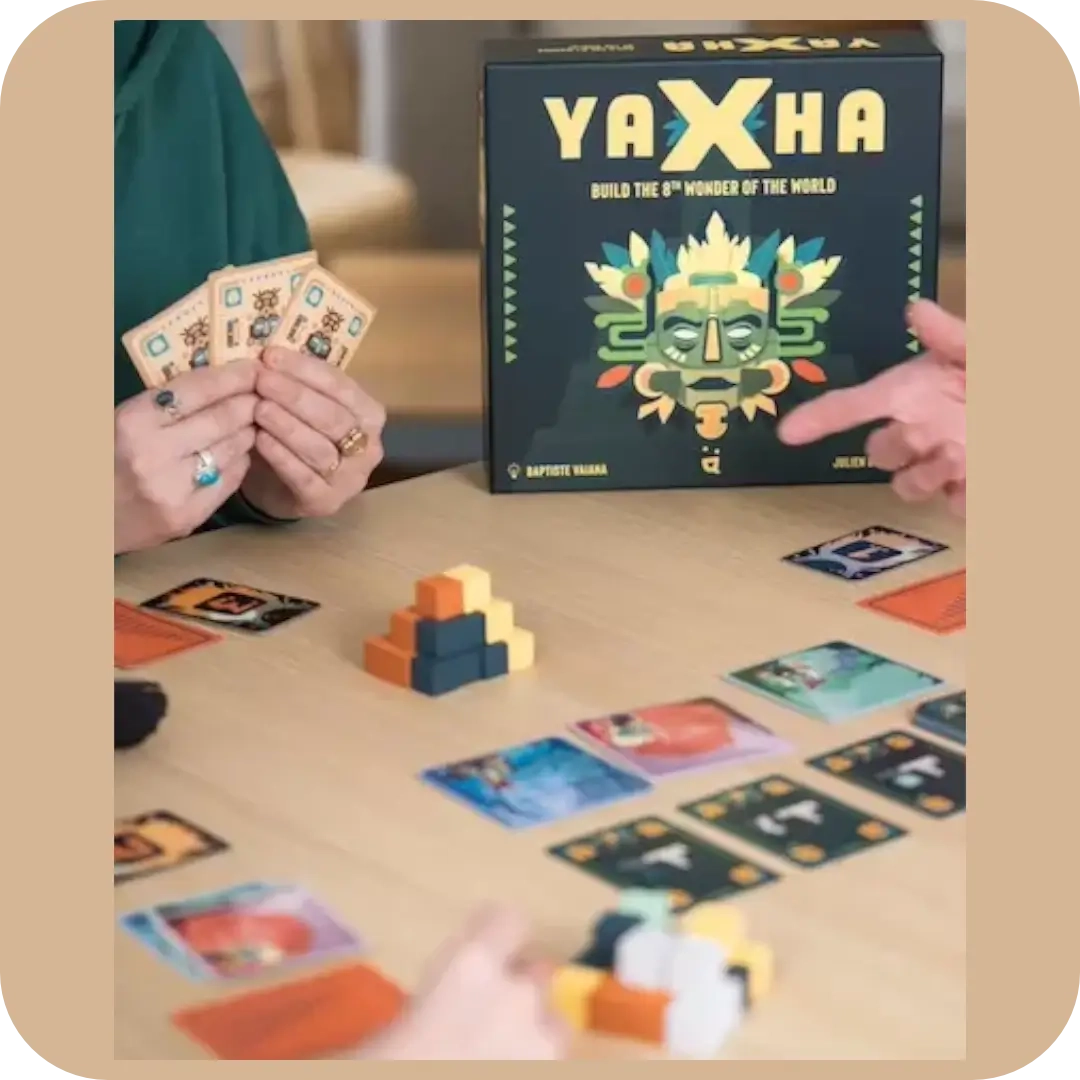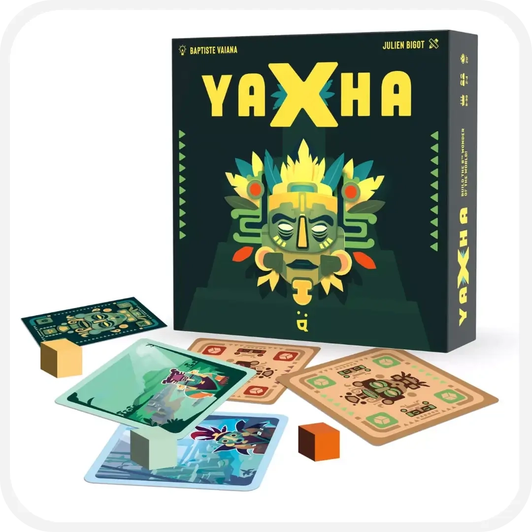 Met YAXHA duik je in een fascinerend strategisch spel waar je jouw eigen Maya-piramide bouwt. Claim kleurrijke blokjes, bouw aan jouw unieke piramide en scoor de meeste overwinningspunten! Met slimme keuzes, verrassende bonuskaarten en snelle rondes beleef je speelplezier voor het hele gezin.