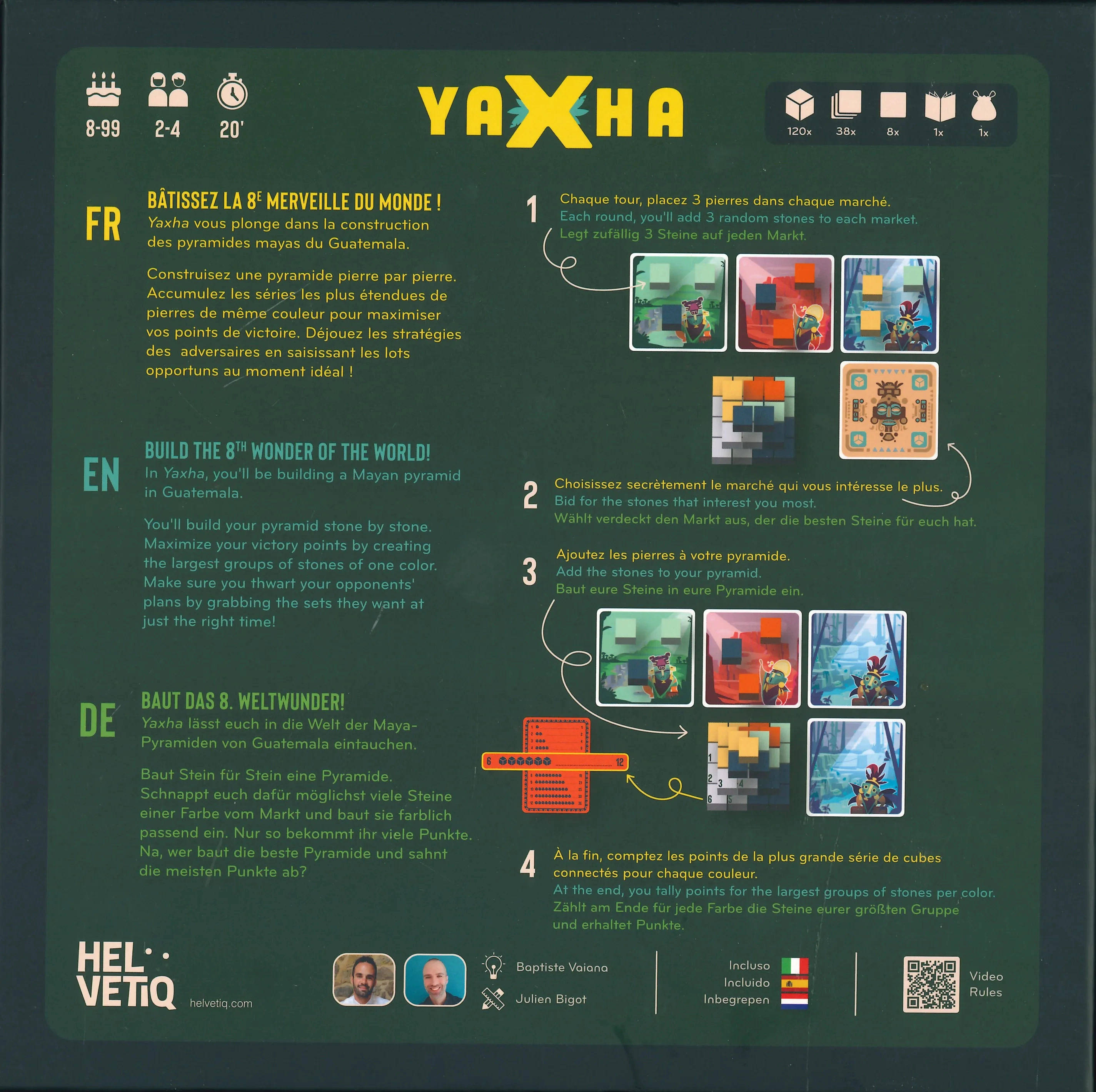 In Yaxha is het jouw missie om door goed te plannen en tactisch te denken de meest indrukwekkende piramide te bouwen. Elke ronde verzamel je blokjes van verschillende kleuren, die je direct moet plaatsen volgens slimme bouwregels. Hoe groter jouw verbonden groepen en hoe beter je inspeelt op de bonuskaarten, hoe meer overwinningspunten je aan het eind scoort. Daag jezelf uit, wees scherper dan je tegenstanders en scoor strategisch extra punten!