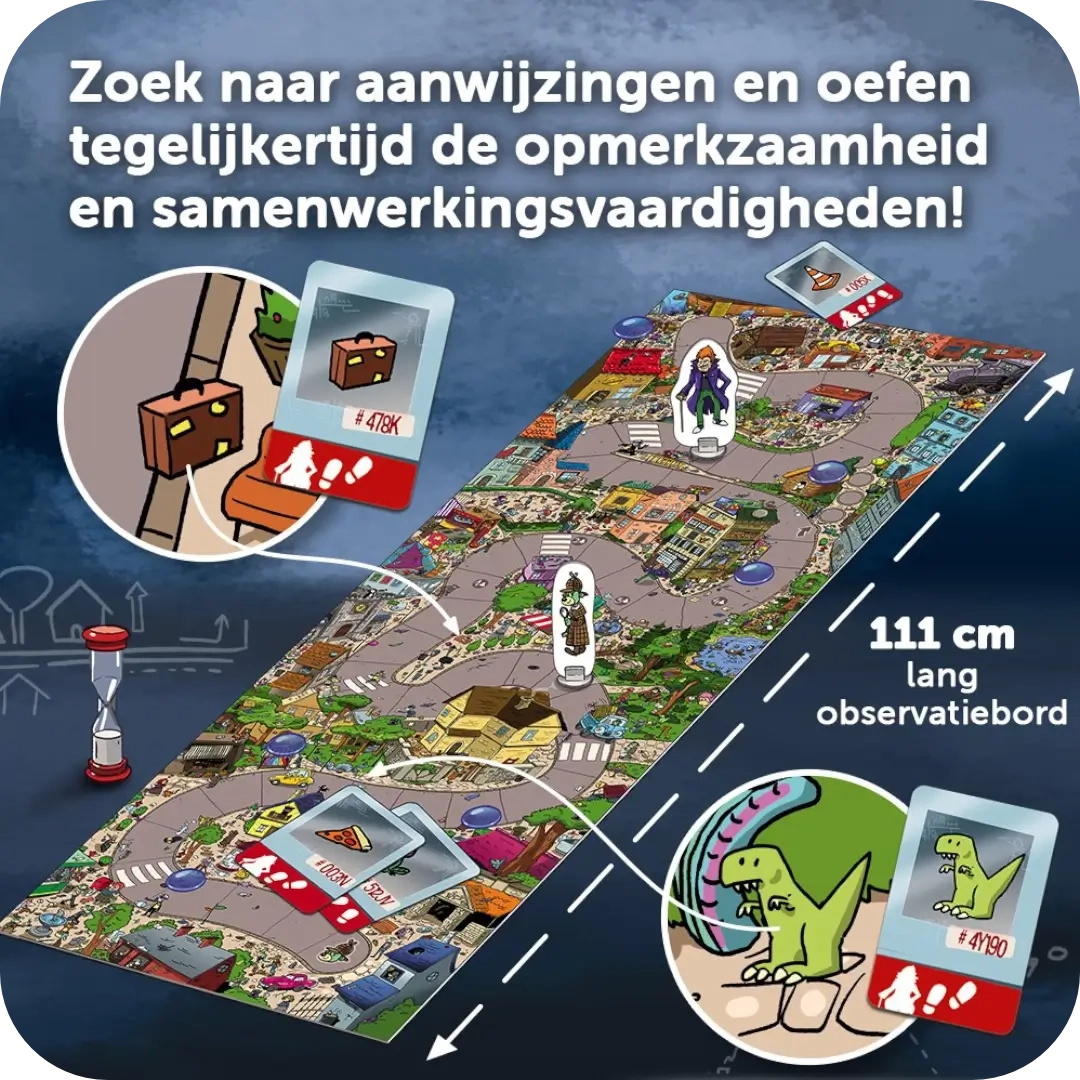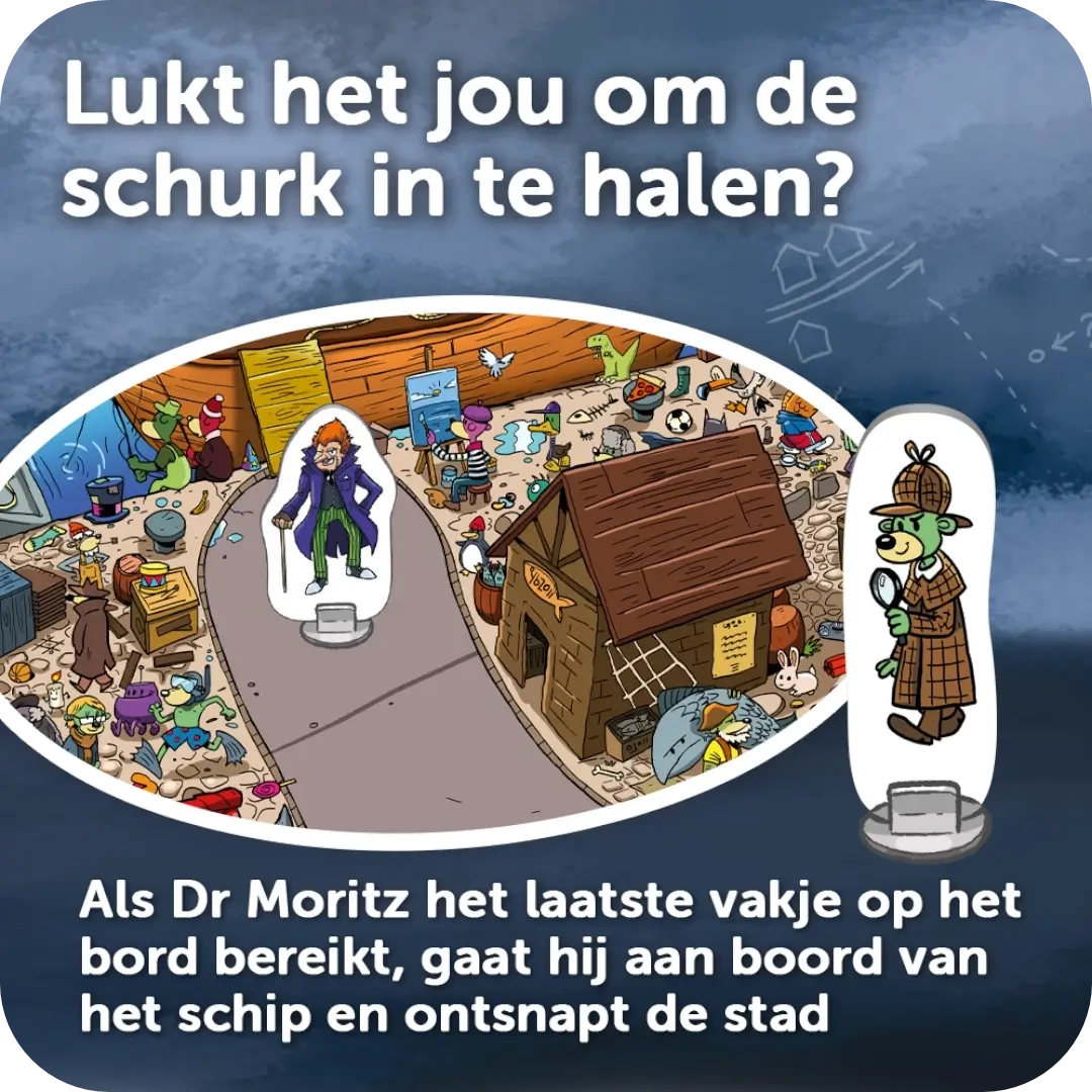 Werk samen als echte detectives, zoek aanwijzingen op het kleurrijke speelbord en ga de strijd aan met de tijd om Doctor Moritz te vangen voordat hij ontsnapt. Perfect voor gezinnen, educatief en altijd meeslepend—lees snel verder en ontdek alles over dit unieke coöperatieve bordspel!