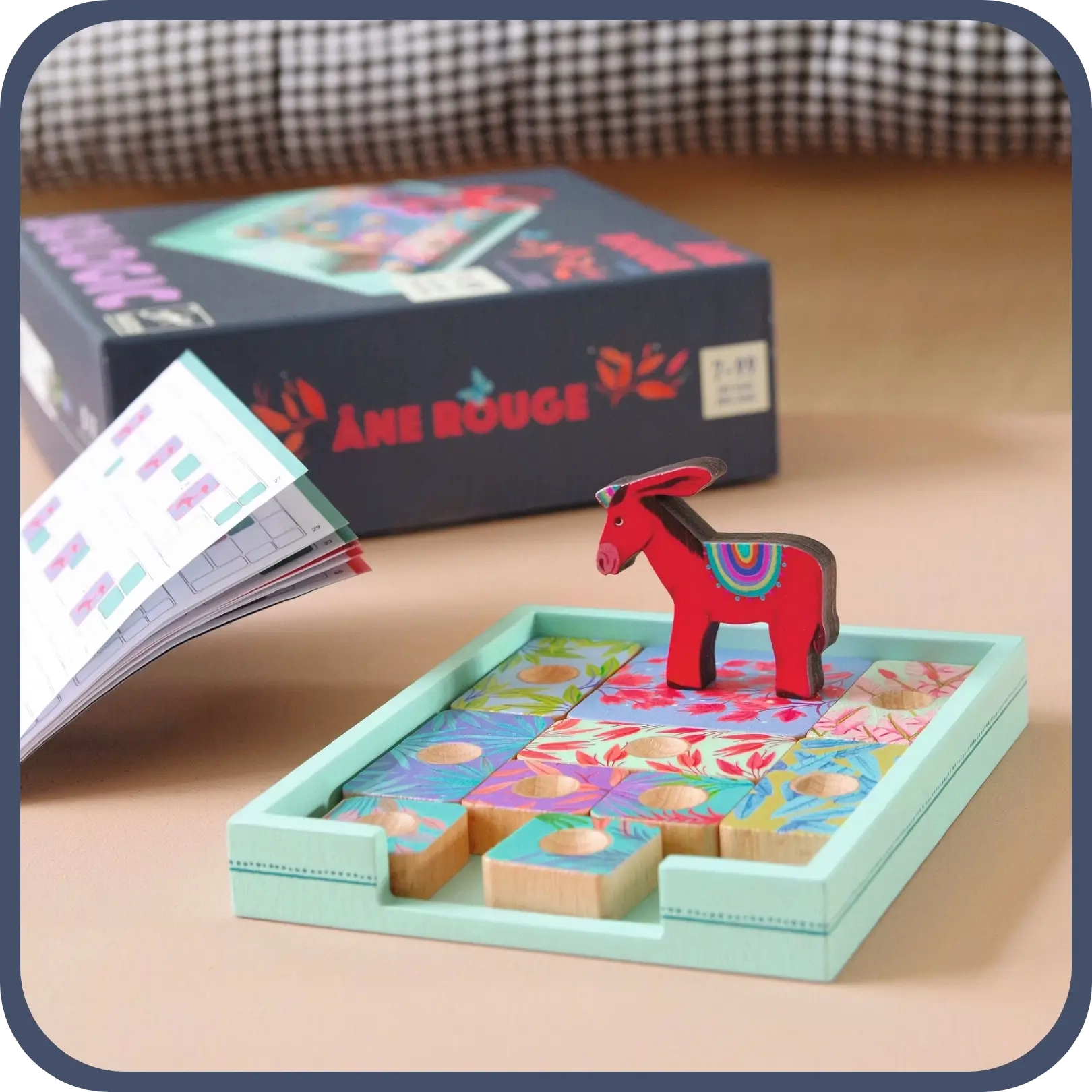 Het doel Âne Rouge is even simpel als uitdagend: bevrijd de rode ezel uit het speelveld! De ezel zit vast, omringd door negen andere houten blokken. Alleen door de stukken slim te verschuiven, kun je een pad vrijmaken naar de enige uitgang. Je moet dus de juiste reeks zetten vinden om de ezel te laten ontsnappen, maar laat je niet misleiden! Dit spel vereist creatief denken, geduld, en een goed oog voor strategie. Met duizenden mogelijke zetten en slechts twee oplossingen, is het de ultieme test voor zowel beginners als ervaren spelers.  Een perfecte breinbreker voor jong en oud!