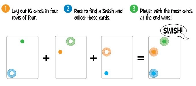 Race tegen je medespelers om zoveel mogelijk Swishes te maken. Een Swish ontstaat wanneer je twee of meer kaarten zo op elkaar legt dat elke bal precies in een ring van dezelfde kleur past. Hoe meer kaarten je in één Swish combineert, hoe meer punten je verdient!