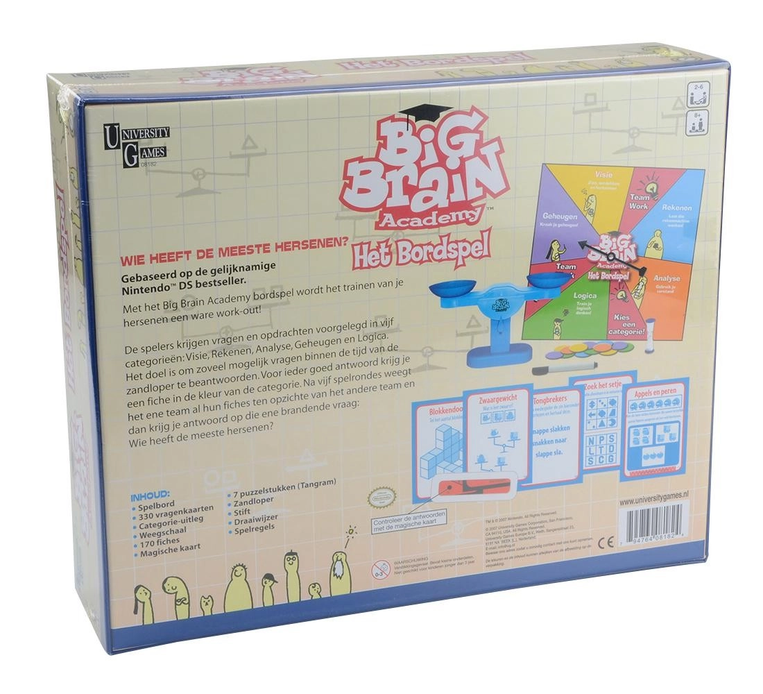 Big Brain Academy is een bordspel gebaseerd op het gelijknamige Nintendo-DS spel. Spelers strijden tegen elkaar in vijf verschillende categorieën: visie, rekenen, analyse, geheugen en logica. Wie heeft de meeste hersenen?