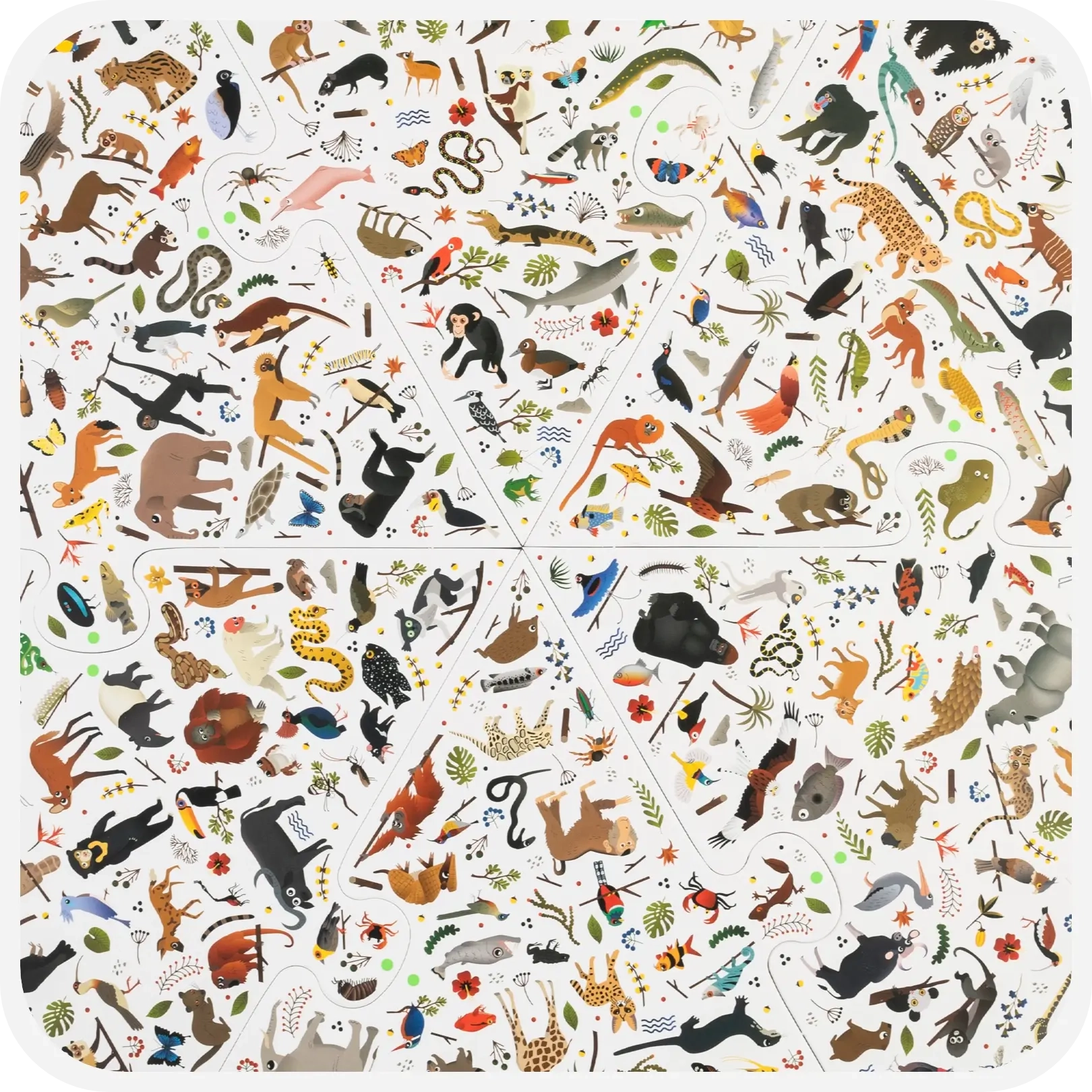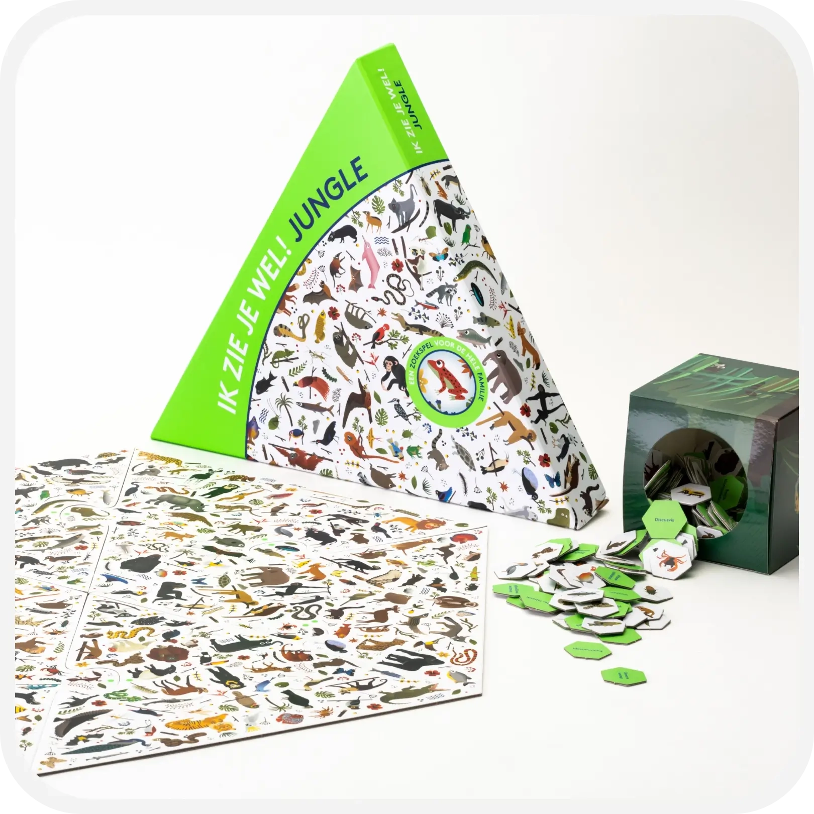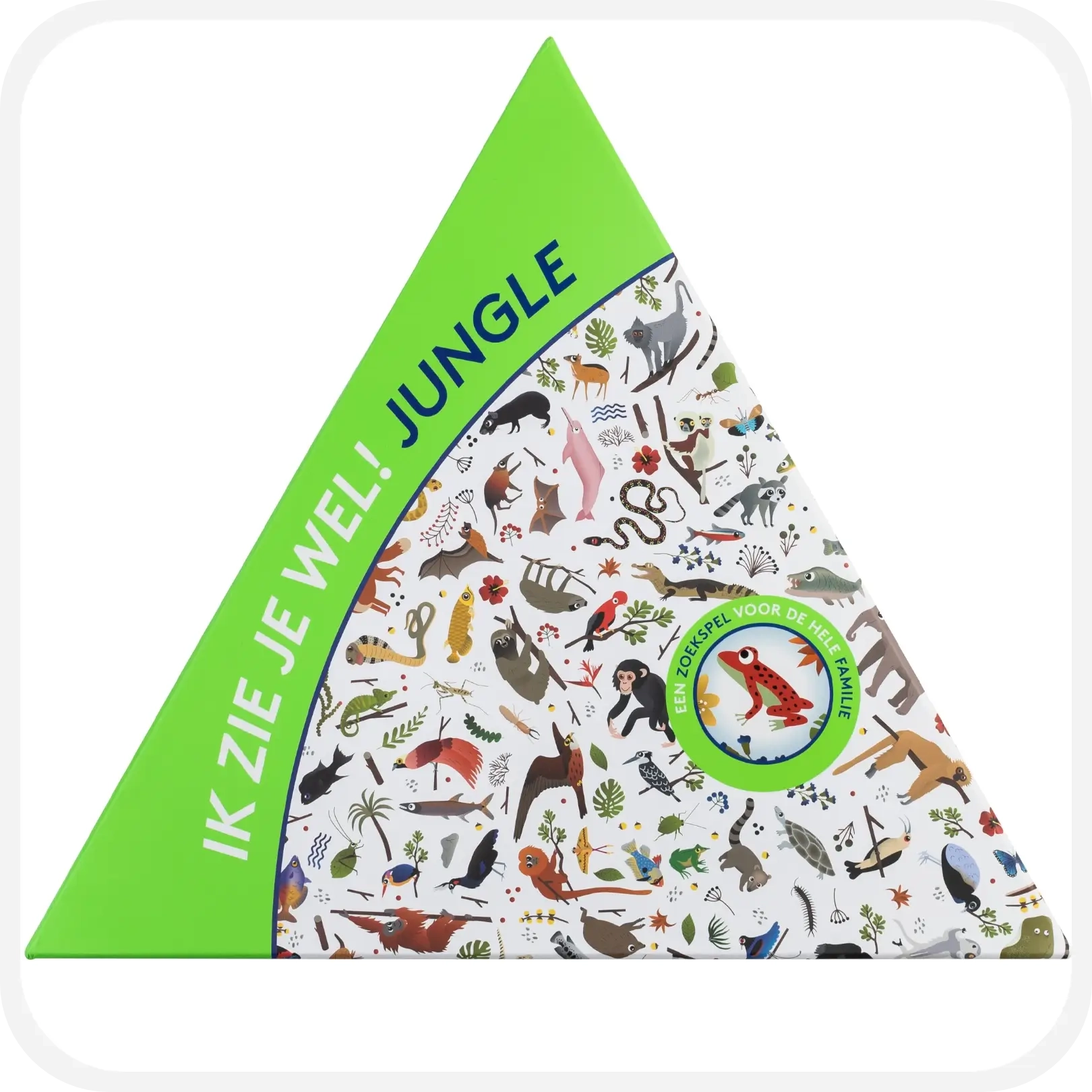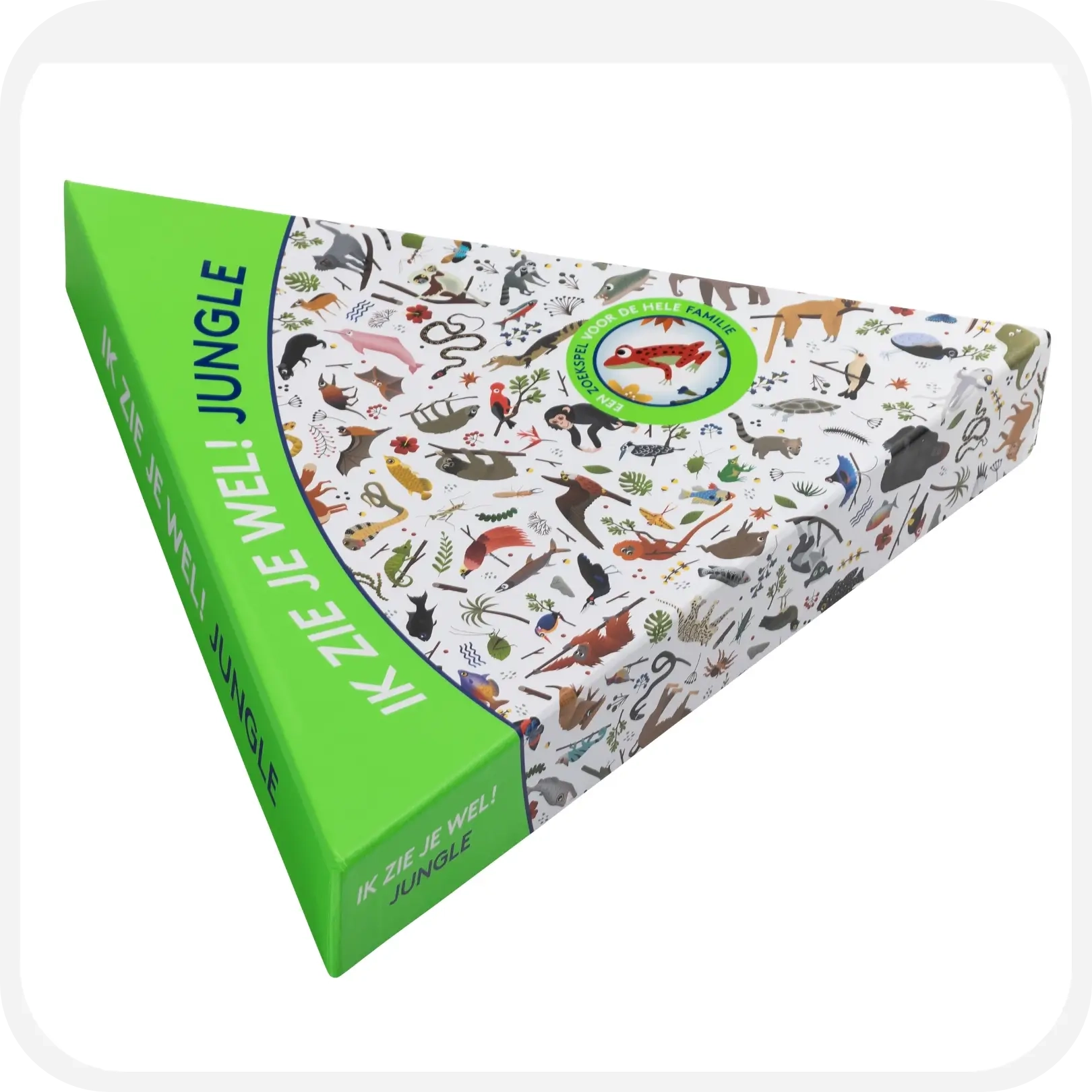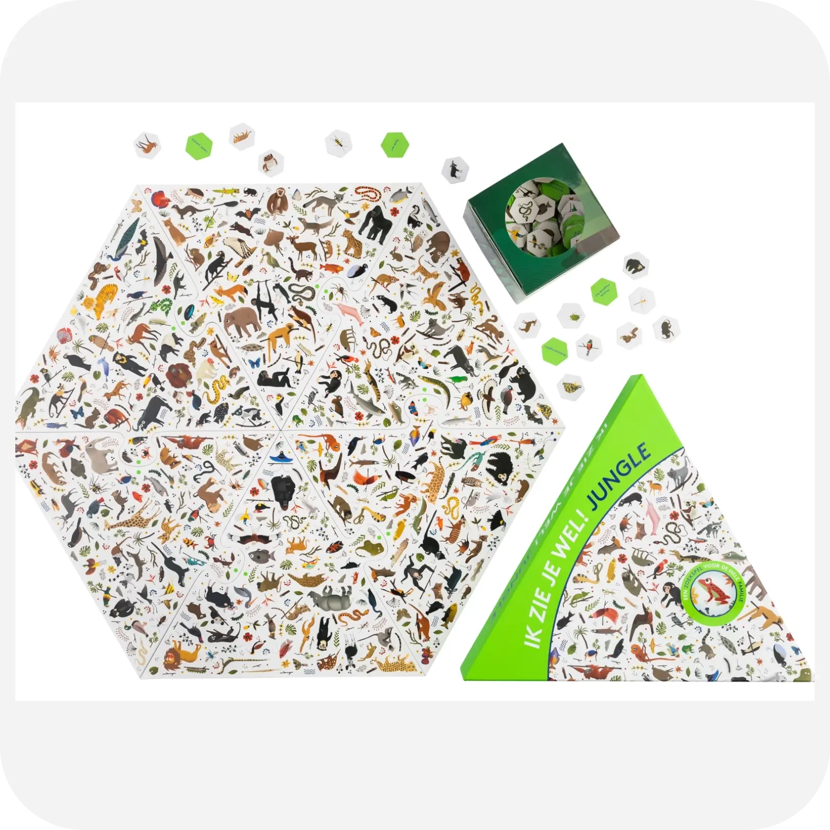Op het speelbord staan maar liefst 300 wilde dieren afgebeeld. Sommige ken je misschien al, zoals de luipaard en de neushoorn, en sommige nog niet. Heb je ooit gehoord van de Kaaimanteju of de Roodkeelhoningzuiger, en hoe zien die er dan uit? Trek een fiche van een dier uit de doos en ontdek als eerste het dier op het bord. Het speelbord bestaat uit zes aansluitende driehoeken die je telkens in een andere volgorde kan leggen zodat het zoeken naar dieren je nooit verveelt.
