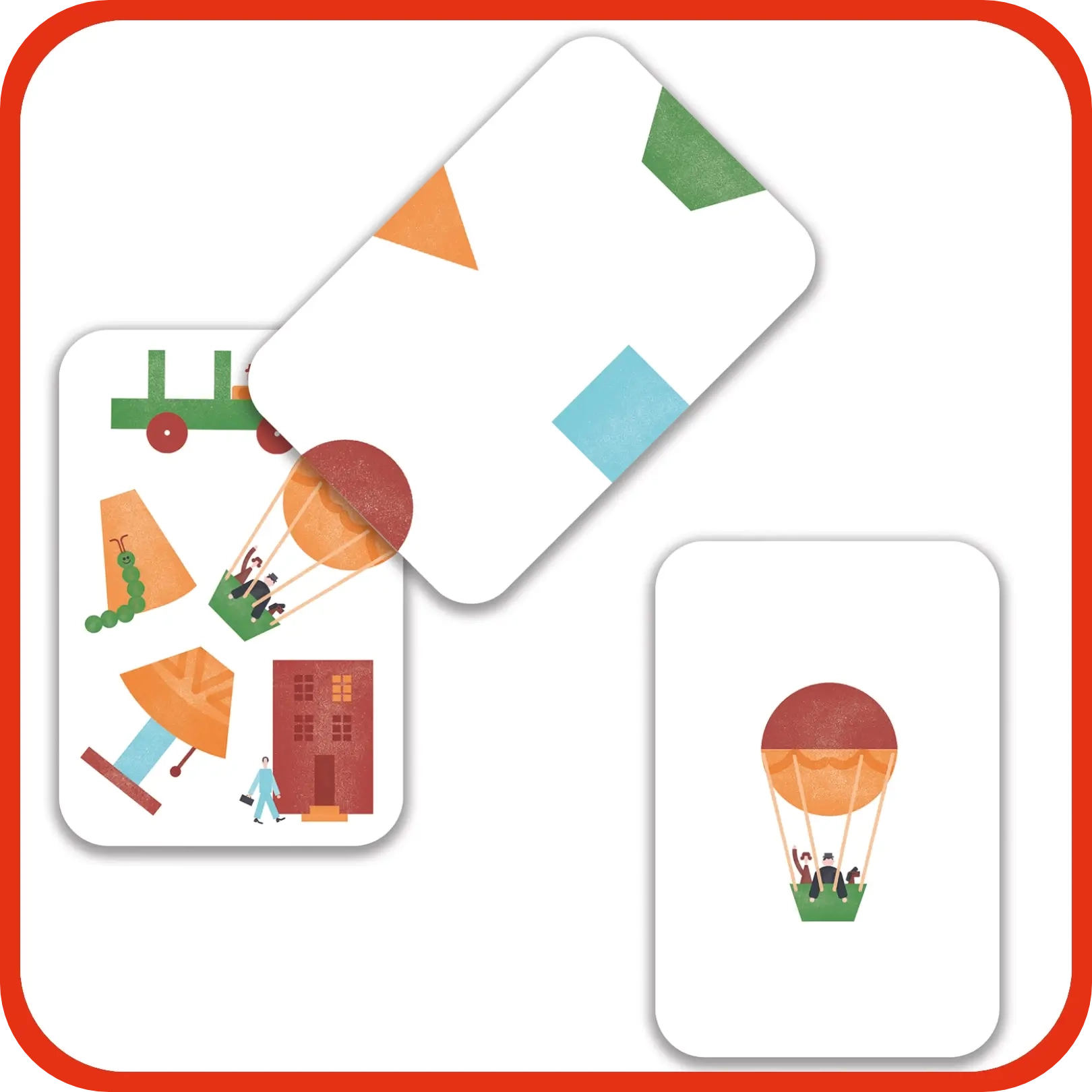 Dan draai je de eerste uitdagingskaart om en leg je die in het midden, zodat iedereen de afbeelding of afbeeldingen goed kan zien. Vanaf dat moment gaat iedereen tegelijk aan de slag. Met alleen de kaarten die je echt nodig hebt, probeer je op tafel de afbeelding van de uitdagingskaart na te maken. Je legt een geometrische vorm in de juiste kleur naast de helft van de bijbehorende tekening, zodat ze samen het juiste beeld vormen dat op de opdrachtkaart staat afgebeeld. Als er twee afbeeldingen op de kaart staan, moet je ze ook allebei correct namaken, wat voor extra spanning en uitdaging zorgt.