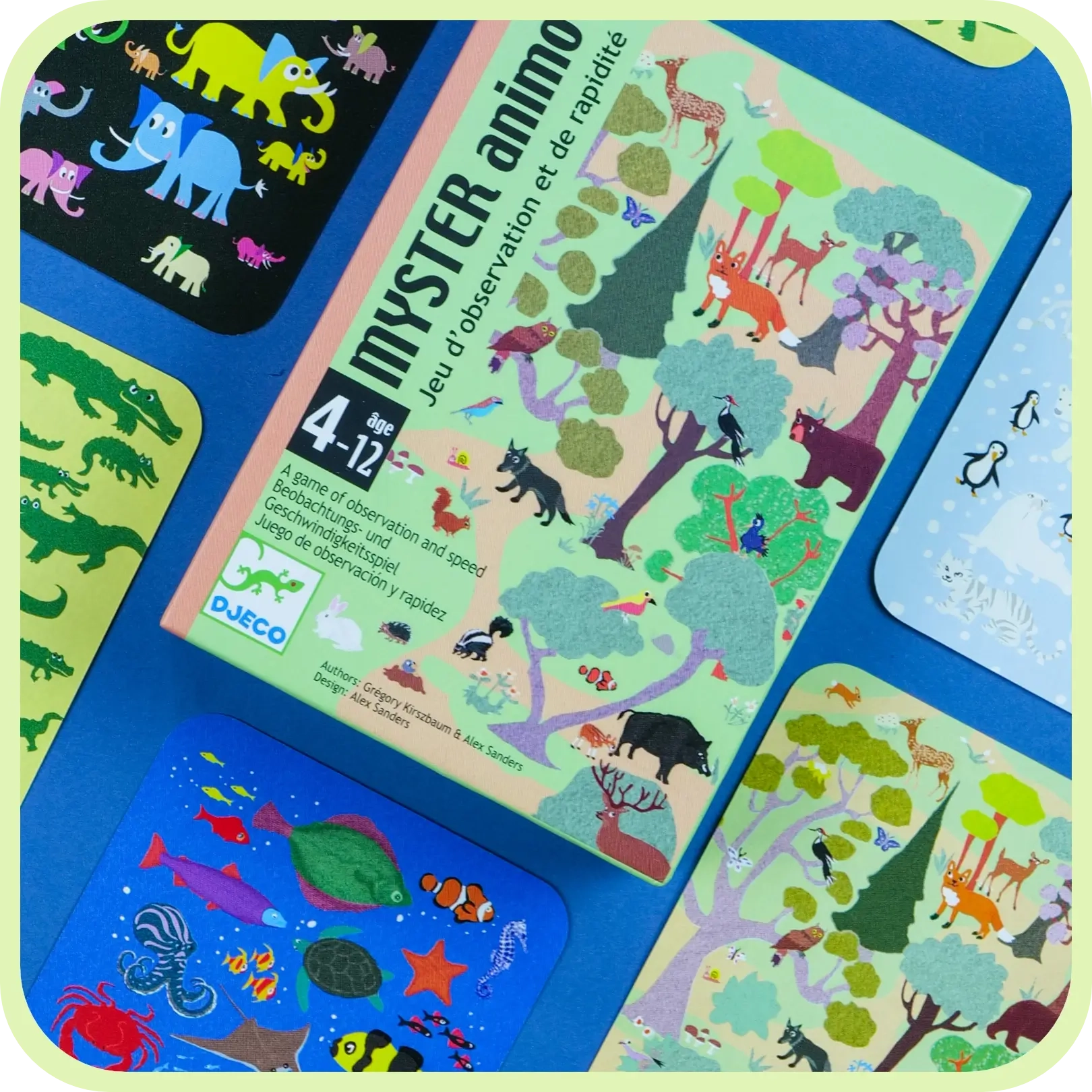 Heb je zin in een snel, toegankelijk spel waarbij je kinderen – en jezelf – uitdaagt om razendsnel de indringer te vinden tussen allerlei dieren en voorwerpen? Leg Myster Animo dan op tafel en ontdek hoeveel kaarten jij kunt winnen. Bestel het spel vandaag nog en ontdek binnekort al wie het scherpste oog heeft voor alles wat niet in de afbeelding thuishoort.