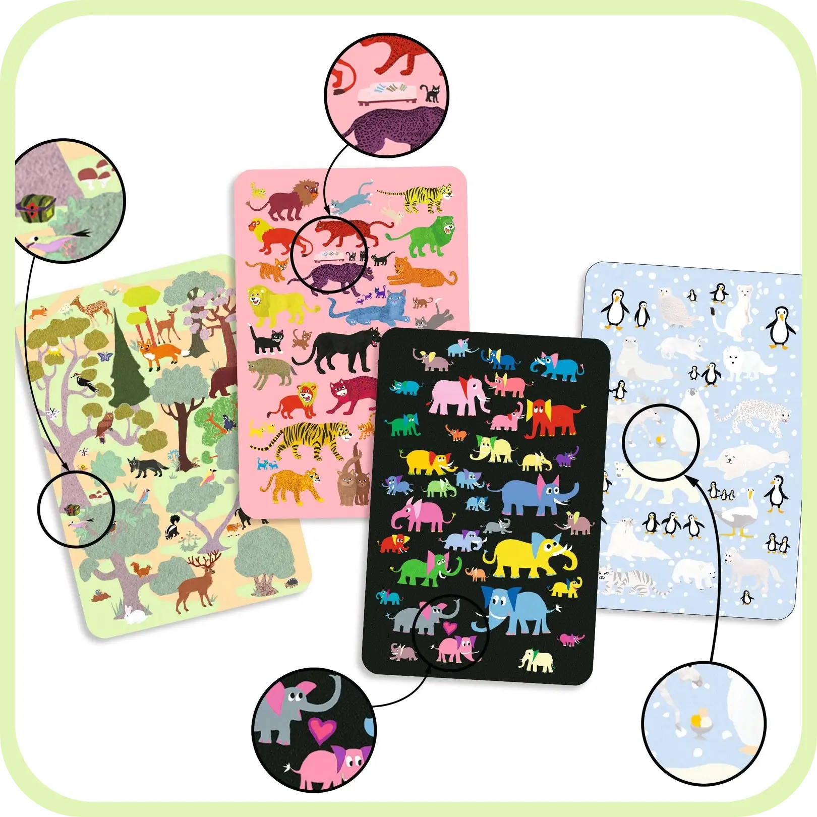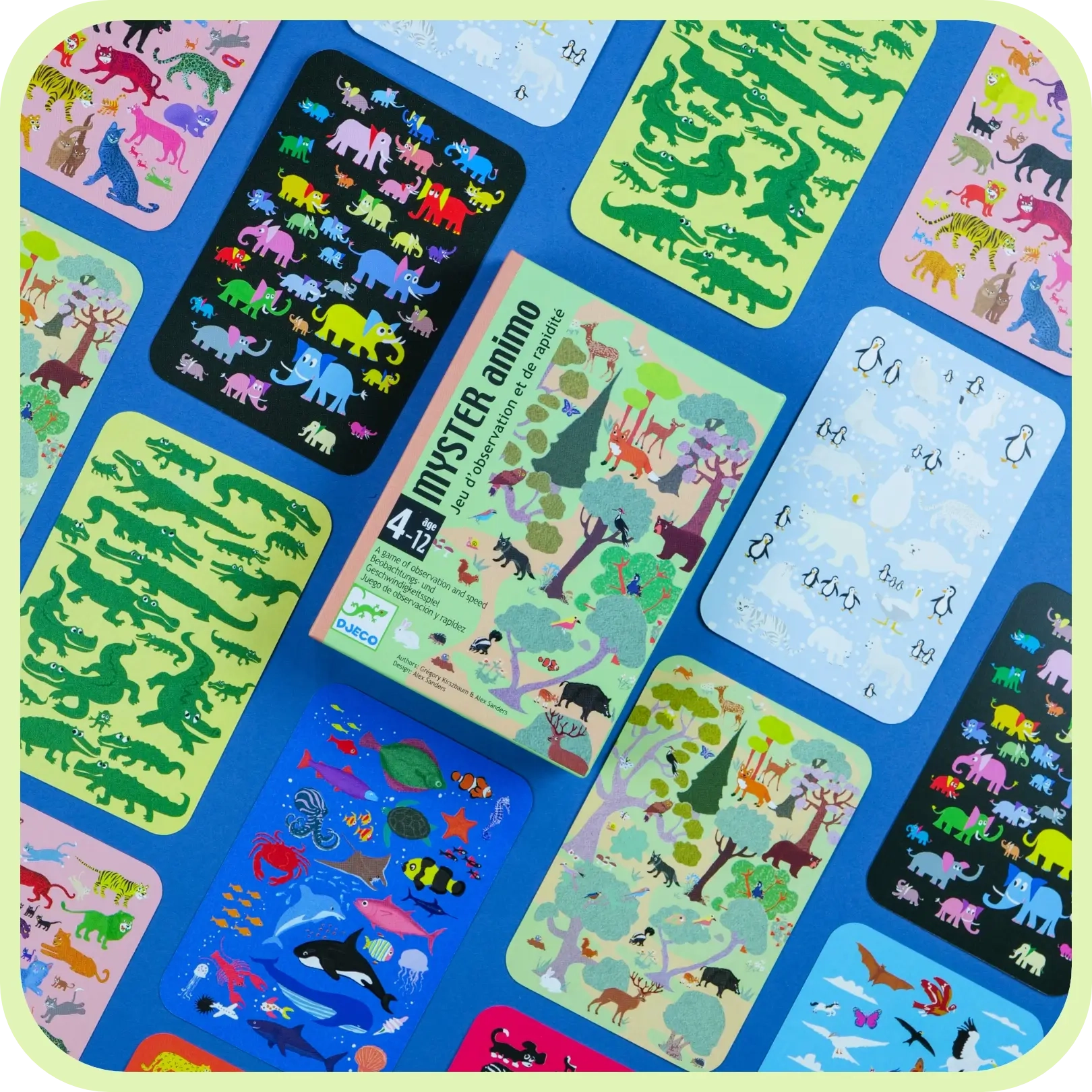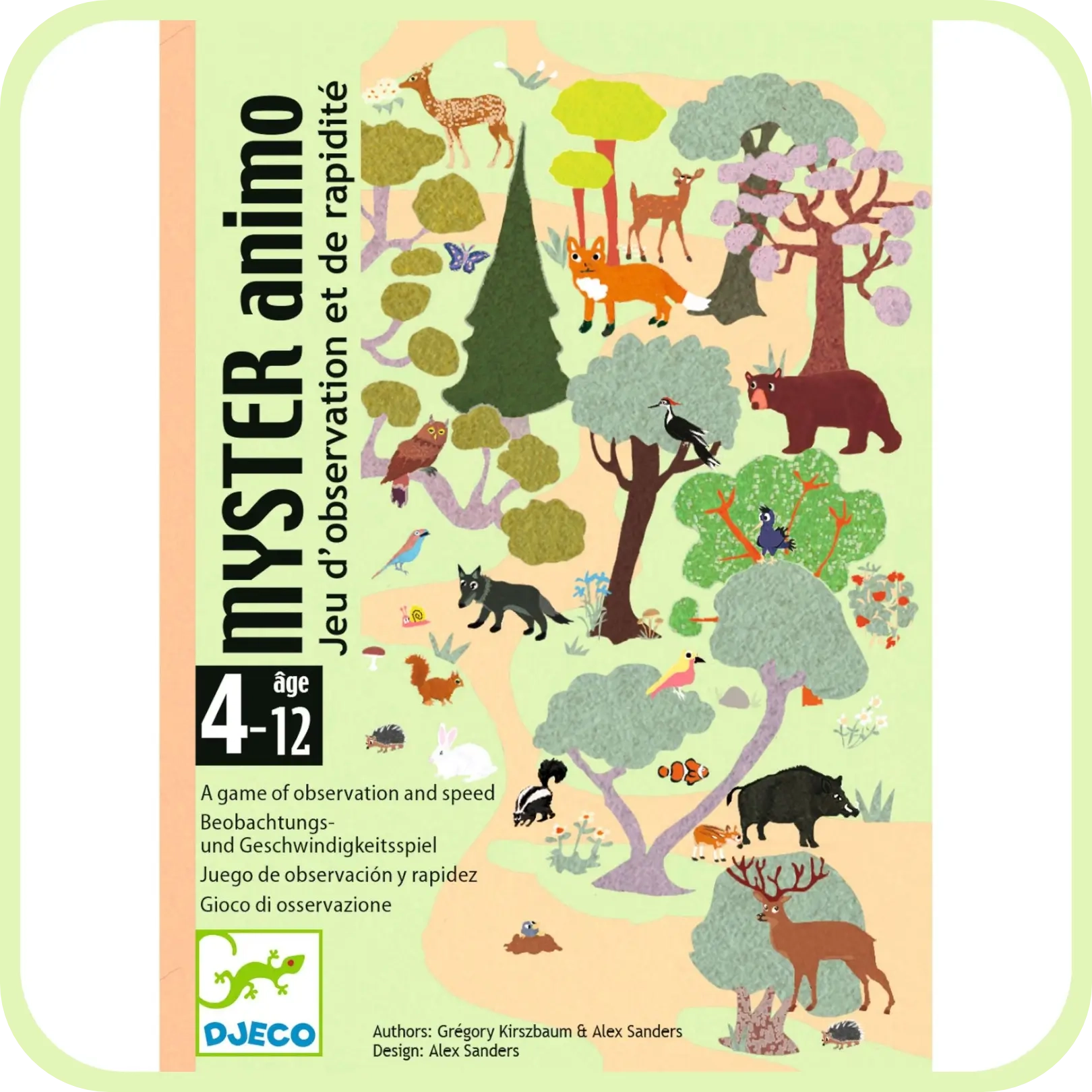 In Myster Animo speel je een leuk, snel observatiespel met kaarten vol drukke scènes, dieren en voorwerpen. Op elke kaart zit één indringer verstopt: een beestje of voorwerp dat niet bij de rest past. Alle spelers zoeken tegelijk en proberen zo snel mogelijk de indringer te spotten, aan te wijzen en hardop te benoemen.