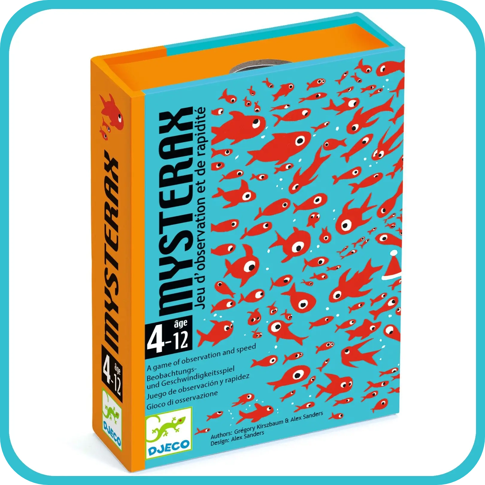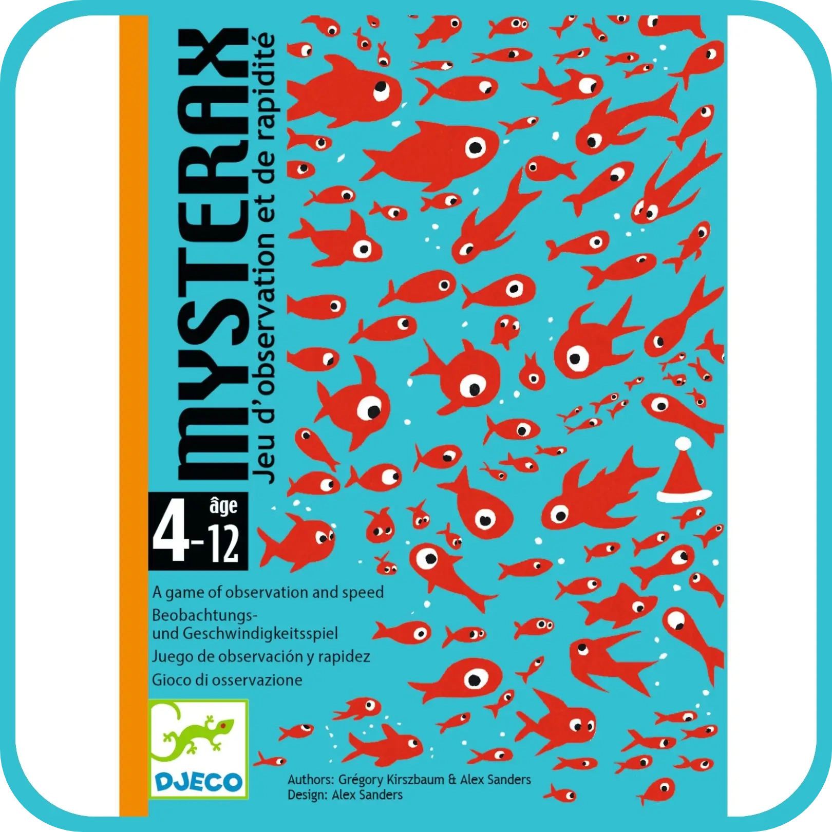 Mysterax is een vlot kaartspel waarin je samen naar kleurrijke afbeeldingen kijkt en steeds op zoek gaat naar één vreemd element: de indringer. Iedereen speelt tegelijk, dus je ogen staan constant op scherp terwijl je de kaarten scant en nét iets sneller probeert te zijn dan de rest. Je wijst het foute voorwerp of dier aan en roept wat je ziet – simpel in opzet, maar toch verrassend spannend.